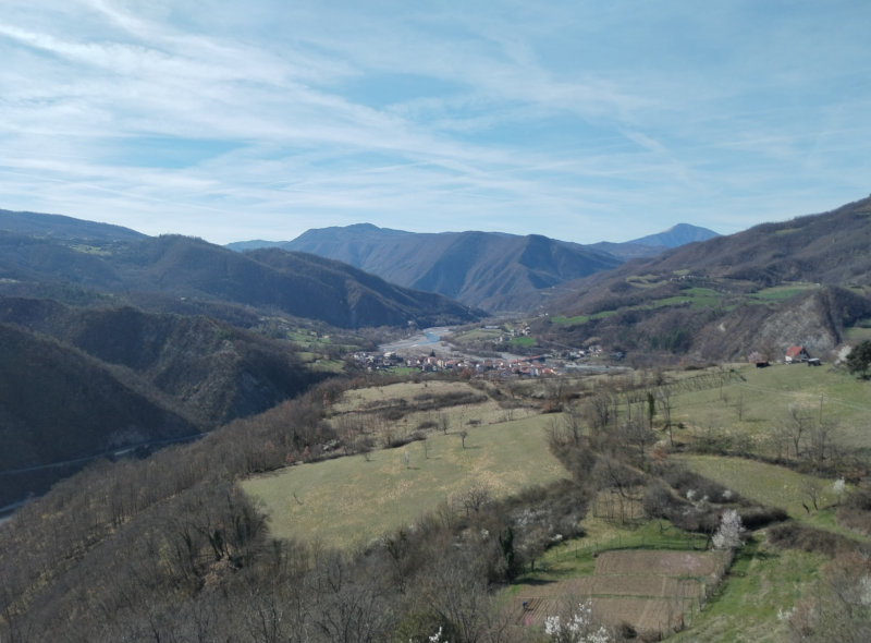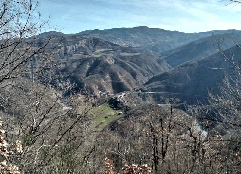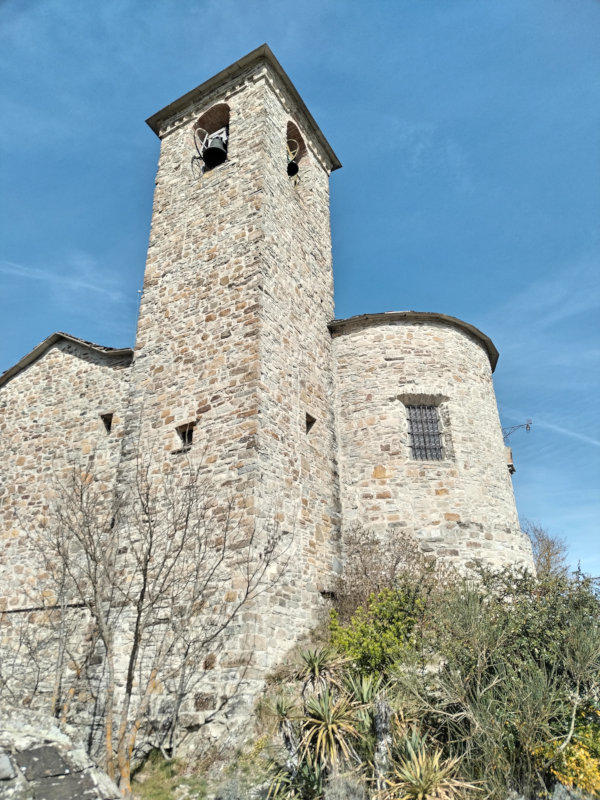 Ancora un tratto di discesa ed entro a Brugnello, costeggiando il muro di cinta del del piccolo cimitero. Il paesino, composto da belle case in pietra, domina dall’alto le anse della Trebbia, in posizione davvero spettacolare. La chiesa dei Ss. Cosma e Damiano sorge su uno sperone roccioso a picco sulla Trebbia: ne approfitto per scattare qualche foto e prendere acqua alla fontanella. Sono ormai quasi le undici, la caviglia fa sempre male, devo iniziare a pensare a come passare la notte. Ipotesi uno: prendo una camera a Marsaglia. Ipotesi due: attacco con la quarta tappa salendo verso il passo del Mercatello e trovo un posto per fermarmi in tenda.