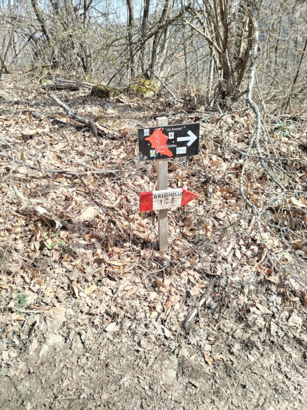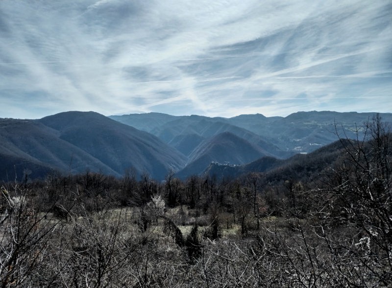 Ignorato il bivio a destra per Moglia, proseguo in salita verso Carana, mentre la strada si restringe ulteriormente. Un km e mezzo dopo arrivo al culmine e inizia un tratto quasi in piano. Un altro km e mezzo, stavolta prevalentemente in discesa, e incappo in un bivio: la mulattiera a sinistra conduce direttamente a Brugnello. Seguendo l’itinerario originale dovrei arrivare a Pietranera e da lì scendere a Brugnello. Considerando che la caviglia inizia a darmi abbastanza fastidio e che sono stufo di fare solo asfalto, scelgo la mulattiera.